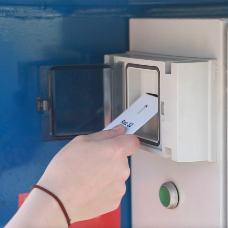 Führen Sie die Chipkarte in die dafür vorgesehene Öffnung. Die vollautomatische Mischanlage stellt in wenigen Minuten Ihren Beton her und gibt diesen über das Förderband ab.